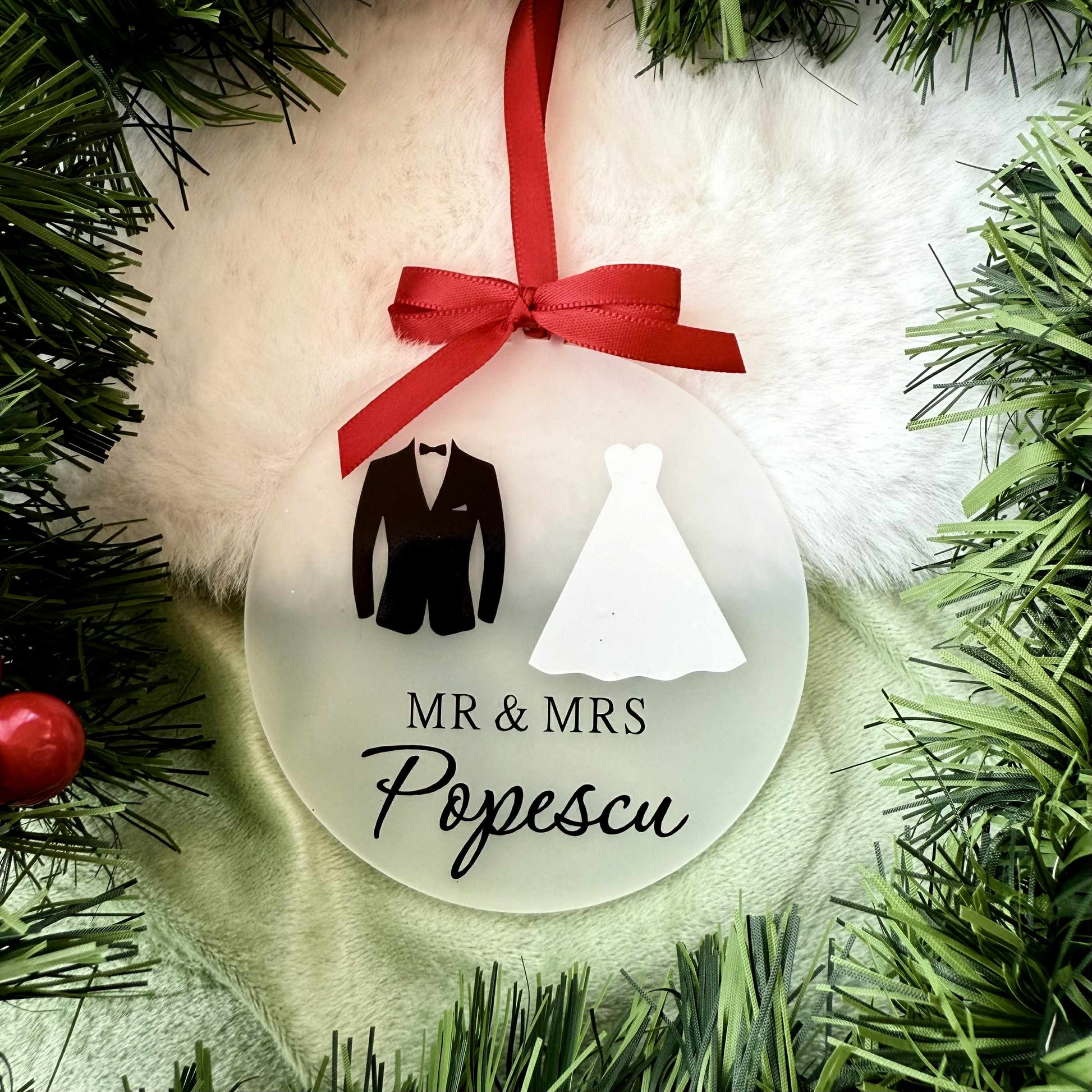 Modelul din imagine conține: Glob semi-transparent mat, autocolant negru (culoarea aleasă va fi folosită doar pentru text, culorile costumului și a rochiei fiind standard), panglică roșie.